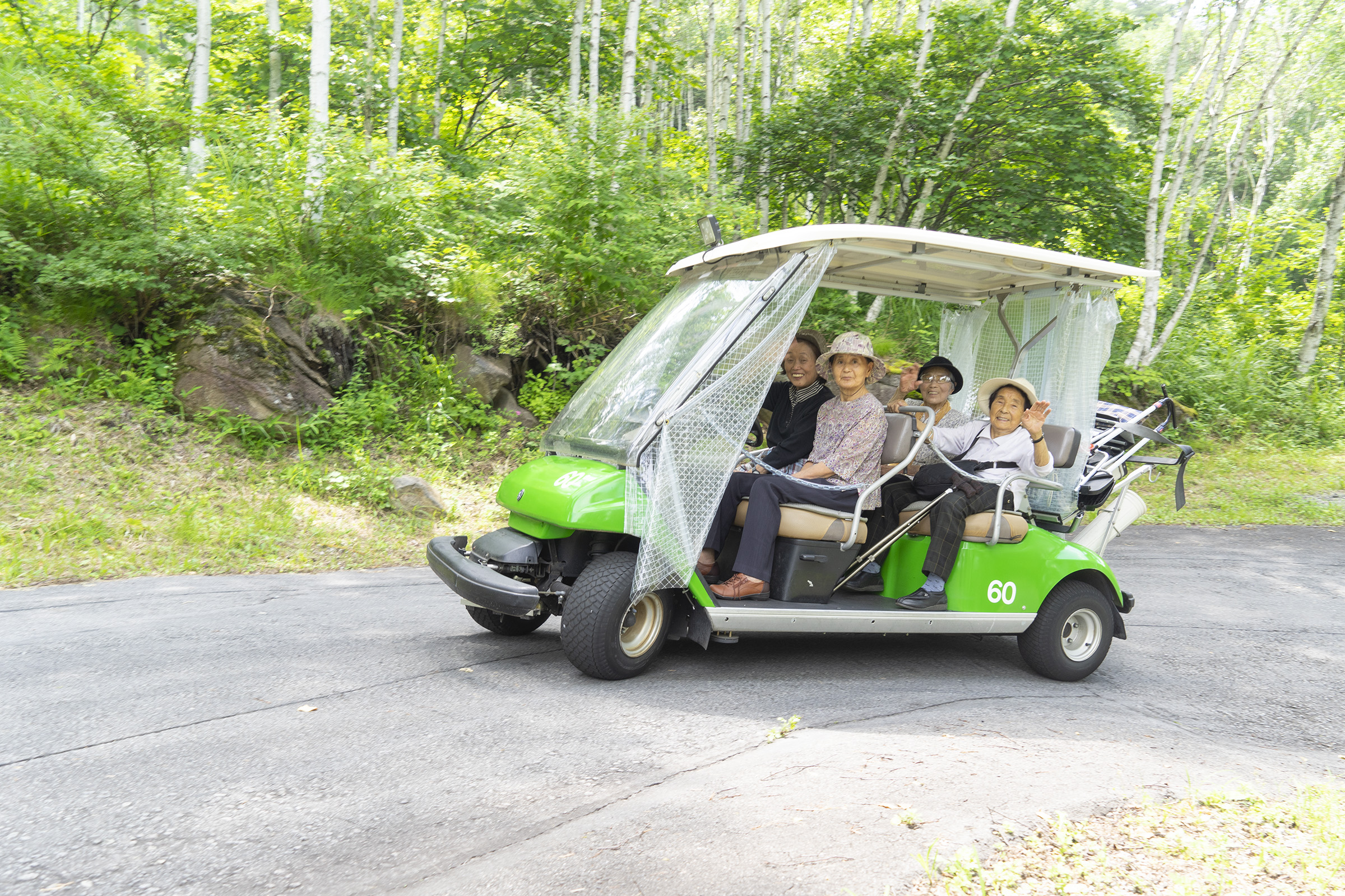 富士見高原リゾートには、富士山や北アルプス、南アルプスを一望できる標高1,420mの高台があり、そこまで自動運転のカートで誰でも手軽に行くことができます。200mの標高差を25分間かけてゆっくり登るため、周囲の森や花々、眼下に広がる雄大な景色を存分に楽しめます。また、カートには普段使用している車いすを積むこともでき、カートを降りた先の遊歩道は車いすでも通りやすいよう幅広く整備されているため、安全に散策することができます。