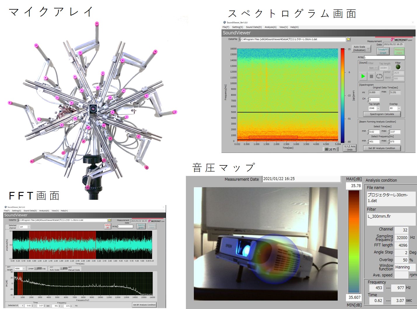 SoundViewer本体(マイクアレイ)とPC上での分析画面、計測結果(音圧マップ)の画面