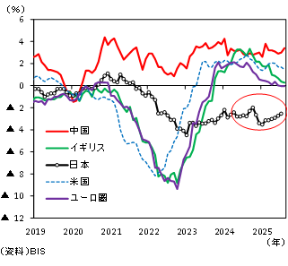 日銀は昨年来、段階的に金融政策の正常化を進めており、主要国が利下げに転じる中でも3度の利上げを実施してきた。しかしながら、食料品価格の高騰を主因とするインフレ率の高止まりにより、実質政策金利は依然として大幅なマイナス圏で推移している(図表1)。これは、コストプッシュ型インフレが継続する中、実質金利が依然としてマイナス圏にある状況下では、日銀のこれまでの利上げが金融引き締めではなく、過度な緩和状態の調整として位置づけられていることを意味する。他方で、消費者マインドの悪化や不動産価格の上昇など、金融不均衡の拡大を懸念する声もあり、追加利上げを求める議論が生じている。