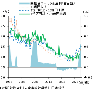 金融機関の貸出金利はいずれの業態とも上昇傾向を示しているが、過去の低金利環境の影響から、実体経済への波及はいまのところ限定的である。特に中小企業向け貸出では、長期固定金利貸出の割合が高いため、短期金利の上昇が利払い負担に直結しにくい構造となっている(図表2)。この結果、地域金融機関では、金利リスクを内包していることになるため、この間の預金金利の上昇と相まって、収益が厳しい先も散見される。今後、利上げの影響は、従来以上にラグを伴って現れる可能性がある点には留意が必要だろう(詳細はレポートをご覧ください)。