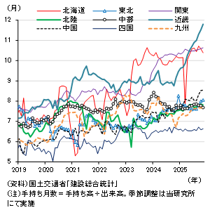 日本経済はこれまで需要不足が主要課題であったが、近年は建設業を中心に供給能力の制約が前面に浮上している。国土交通省「建設総合統計」から算出する手持ち月数は、北海道・関東・近畿の「3極」で急伸し、施工能力を恒常的に上回る需要流入が続いていることを明確に示している(図表)。特に北海道では次世代半導体関連投資が需給逼迫を強め、関東・近畿でも再開発・大型プロジェクトが重なり、建設リソースの過熱感が強まっている。一方、中部・四国・九州では相対的に余力が残存しており、地域間の供給力ギャップが構造化しつつある。加えて東北では出来高の減少が進んでおり、需給逼迫とは異なるかたちで供給力を制約している点が特徴的である。